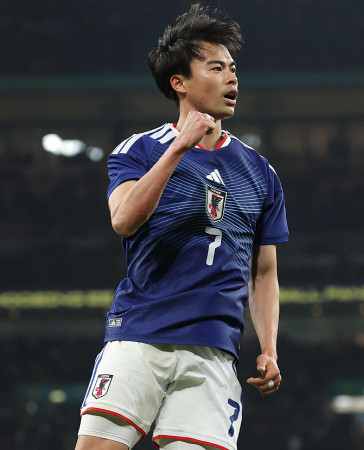 サッカーの国際親善試合は3月31日、ロンドンのウェンブリー競技場で行われ、日本代表はイングランド代表を1―0で破り、初勝利を挙げた。写真は前半、先制ゴールを決め、ガッツポーズする三笘。 【時事通信社】
