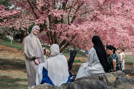 3月31日、米ニューヨーク・マンハッタン中心部のセントラルパークで、見頃を迎えた桜の花見を楽しむ人々。春の訪れを告げる存在として市民に親しまれている。 【EPA時事】