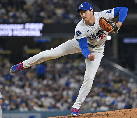 ドジャースの大谷はガーディアンズ戦に1番投手兼指名打者で出場して今季初登板し、6回1安打無失点で勝利投手となった。打者では3打数1安打、2四球で3出塁。ドジャースは4―1で勝った=31日、ロサンゼルス 【時事通信社】