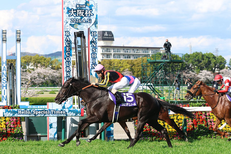 中央競馬の第70回大阪杯は5日、阪神競馬場の芝2000メートルコースに15頭が出走して行われ、北村友一が騎乗した単勝1番人気のクロワデュノール(左)が1分57秒6で優勝した。 【時事通信社】