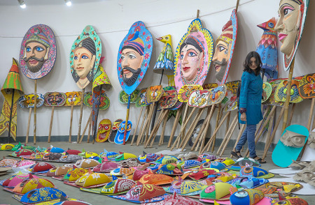 バングラデシュのダッカ大学で、色とりどりの仮面や飾りを用意する人。同大芸術学部が毎年4月14日のベンガル暦新年に主催するパレードはユネスコの無形文化遺産に登録されており、今年も着々と準備が進んでいる。 【EPA時事】