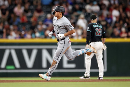 ホワイトソックスの村上はダイヤモンドバックス戦に3番一塁で出場し、7回に5試合連続本塁打となる10号2ランを放つなど、5打数3安打2打点だった。チームは7―11で敗れた=22日、フェニックス 【AFP時事】