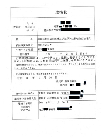 警察官を装った特殊詐欺で今年に入り、ニセ逮捕状がレターパックで郵送され、多額の現金がだまし取られる被害が各地で相次いでいる。警察は注意を呼び掛けている。写真は愛知県内に郵送されたニセ逮捕状(県警提供) 【時事通信社】