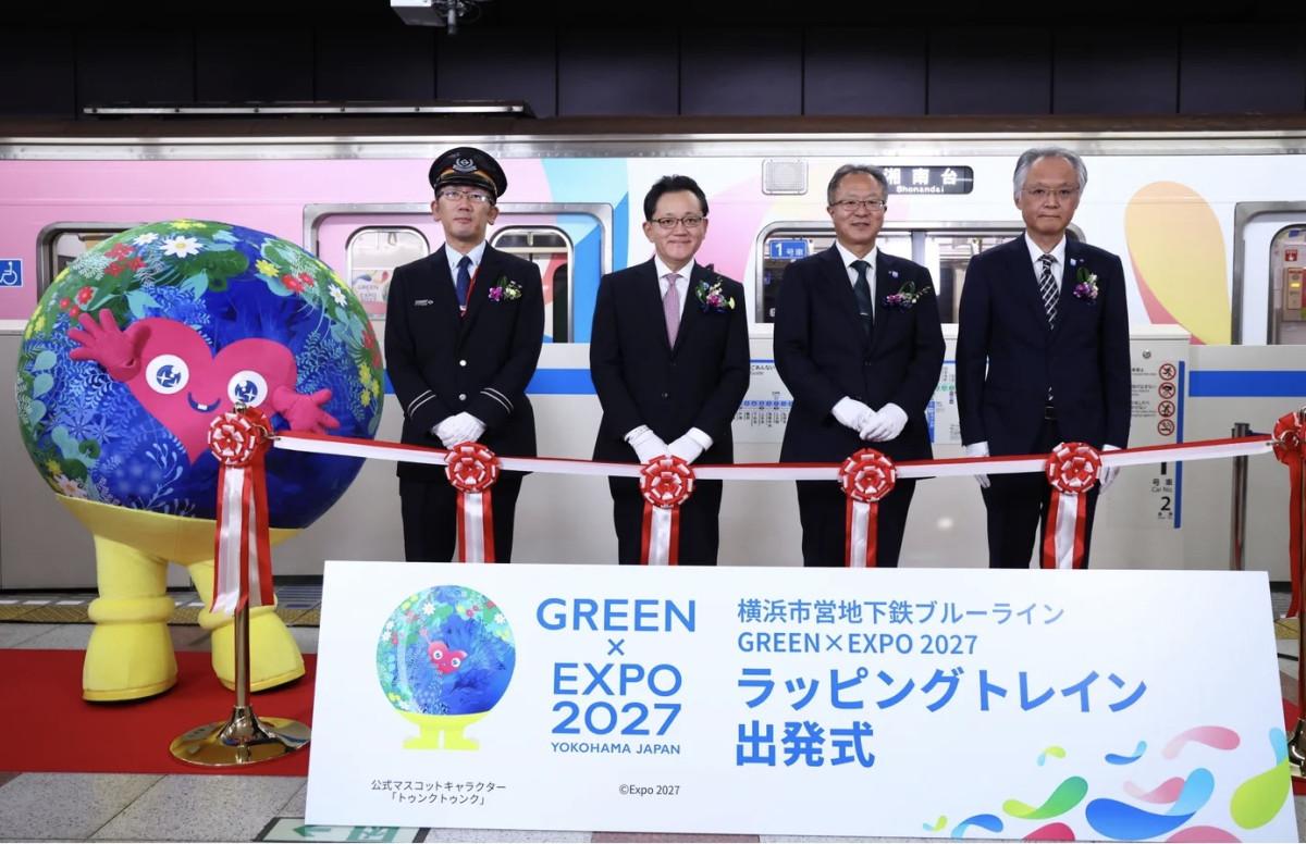 横浜市営地下鉄ブルーラインあざみ野駅(横浜市青葉区あざみ野2)で10月28日、2027年国際園芸博覧会(GREEN×EXPO 2027)の開催を記念したラッピングトレインの出発式が行われた。
