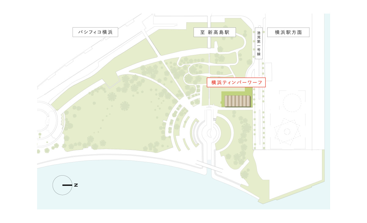 「横浜ティンバーワーフ」は臨港パーク内の北東部に位置する。新高島駅・横浜駅からのアクセスが可能で、パシフィコ横浜に隣接。南側は海と広場に面し、開放感のある立地で芝生エリアや遊歩道が施設周囲に広がる。