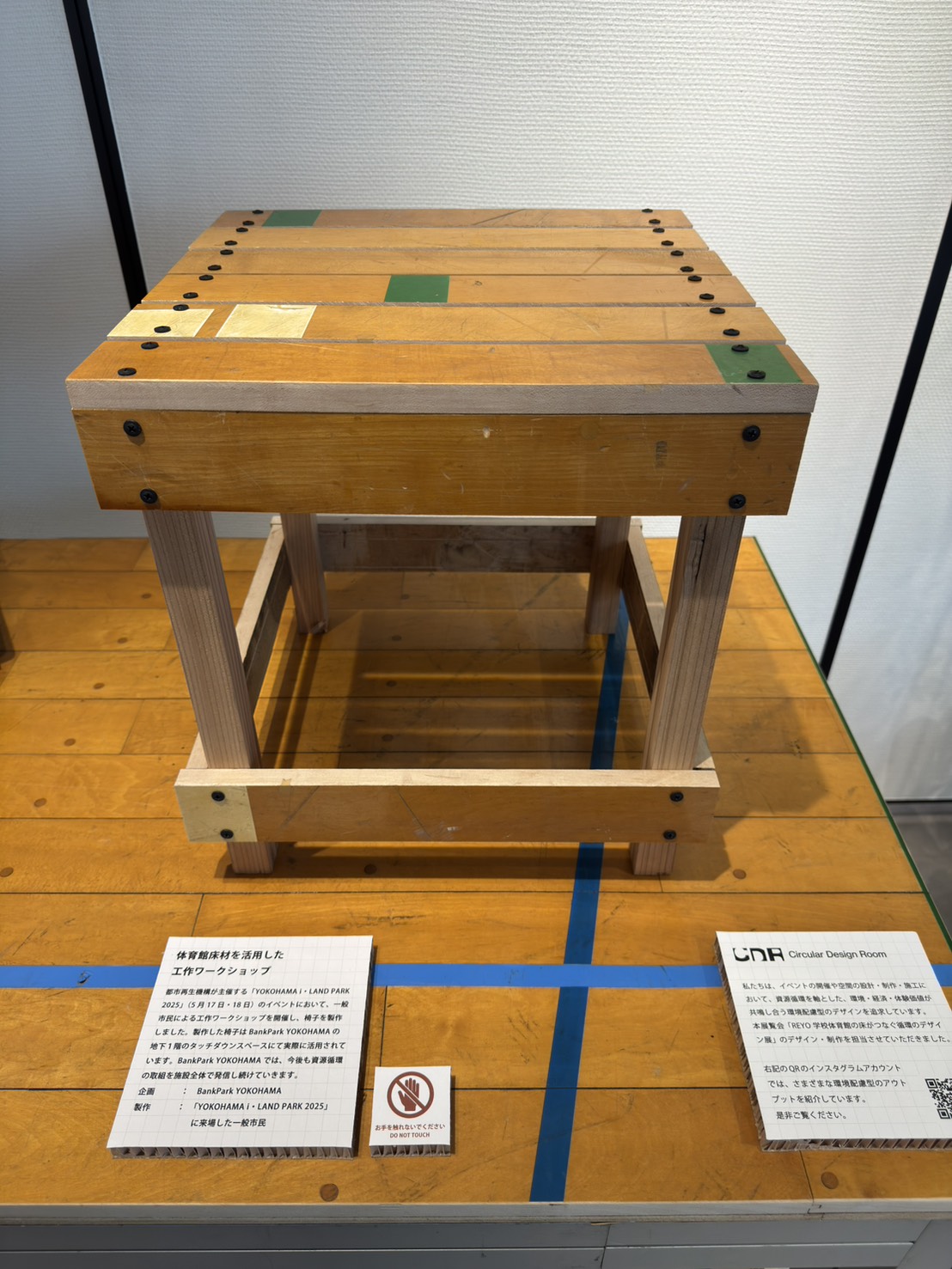 横浜市庁舎(横浜市中区本町6)で11月1日から、公共建築物の床材再利用に関する展示会「REYO(リヨー)学校体育館の床材がつなぐ循環のデザイン展」が始まった。