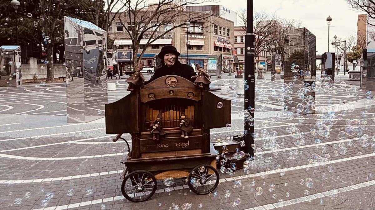 手回しオルガンで出迎え 開港広場公園清掃