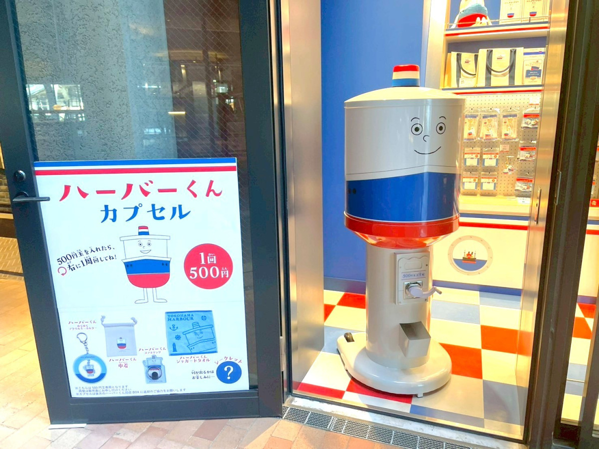 ありあけ(横浜市中区日本大通)が3月19日、同日開業する「BASEGATE横浜関内」(横浜市中区港町1)に「横濱ハーバースタジアムBASEGATE横浜関内店」をオープンする。写真は。ありあけ初となるハーバーくん型のカプセルトイマシン(1回500円)。きんちゃく袋やモバイルリングなどオリジナルグッズをランダムで販売する。
