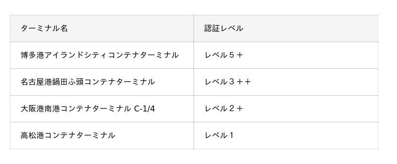 国土交通省が運用する制度で、認証申請のあったコンテナターミナルにおいて、温室効果ガスの排出削減等の取組をレベル1~5の多段階で評価するものです。