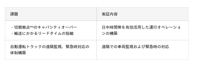 本会議では、2024年10月の設立以降、レベル 4 自動運転トラックによる幹線輸送サービスの開始に向けて、参画企業がそれぞれの知見やノウハウを持ち寄り、国土交通省や総務省も交えて運行オペレーション上の諸課題を抽出するなど、毎月協議を重ねてきました。さらに本年に入ってからは、議論に加えて、以下2件の課題について実証*?も行ってまいりました。