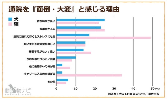 通院負担の理由も対照的。犬は「待ち時間・費用」、猫は「キャリー・移動」がネック