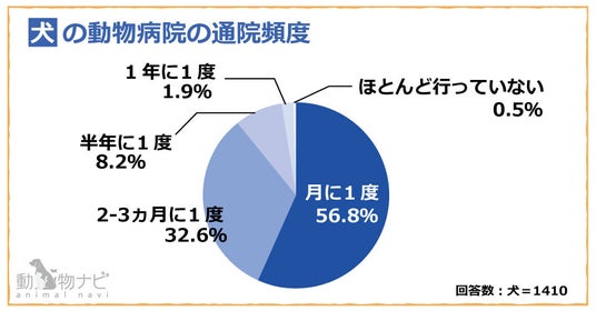 犬においては予防医療が通院の主要な動機となり、「月1通院」が56.8%、「2~3ヶ月に1度」が32.6%で、約9割が2~3ヶ月に1回以上通院していることが明らかになりました。