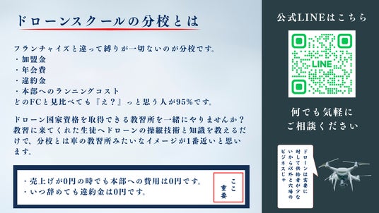 ドローン産業の急成長の裏で、旧来のシステムが生んだ歪みによって、意欲ある経営者や技術を持つインストラクターが夢を絶たれることは、業界全体の大きな損失です。私たちは、これまでの「本部が搾取する構造」を終わらせ、共に成長し、支え合える真のパートナーシップを全国に広げたいと考えています。