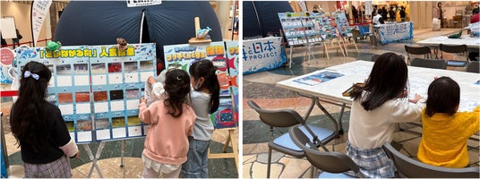 エアドームの外でも、子どもたちの探究心を刺激する多様なコンテンツを設置しました。エアドーム入場口横に設置されたのは、特殊印刷技術で魚の鱗(うろこ)の凹凸をリアルに再現した「さかなかるた」の大型パネルです。エアドームに興味をもって近くに来てくれた家族連れや開場を待つ家族連れが、パネルを指先でなぞりながら視覚だけでなく触覚をフルに活用して魚の生態を予想し合う姿が印象的でした。また、併設された「さかなかるた人気投票」では、子どもたちが真剣な表情でパネルと向き合い、お気に入りの一匹を選んでシールを貼っていく姿が見られました。単なる展示に留まらず、自ら選択し参加するプロセスを経ることで、魚への関心がより主体的なものへと変化していく様子が伺えました。さらに、会場内に設けられた「海の生き物塗り絵」スペースは、親子で海の世界に没入できる場となっていました。自由な発想で魚たちに色を塗る子どもたちと丁寧にリアルさを求めて色を塗る親たちが一緒にペンを走らせ、完成した作品を嬉しそうに見せ合う光景は、イベントが「家族の対話」の起点となっていることを物語っていました。