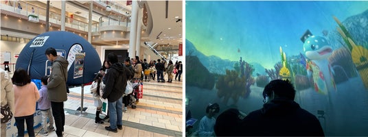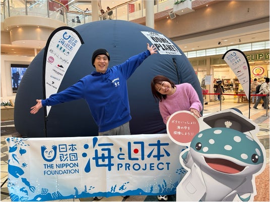 神奈川県小田原市中里にある大型ショッピングセンターのダイナシティにて、Virtual Ocean Project企画「海の大冒険!ブッチくんと学ぶ探検ツアー!」で、360度映像のエアドーム型体験プログラムを開催しました。参加者に、海中映像とナビゲーターのジンベエザメのブッチくんとのリアルタイム対話を通じて、海の魅力や海洋問題について学ぶ機会を提供しました。また、魚の鱗の凹凸を再現した「さかなかるた」パネルを設置し、五感を刺激するプログラムで多角的に海への関心を深めました。