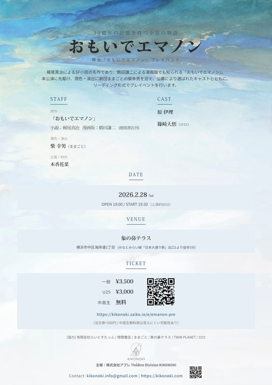 株式会社アプレ Theatre Division KIKONOKIは、梶尾真治によるSF小説の名作『おもいでエマノン』の舞台化プロジェクトを始動します。