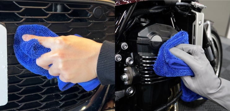 グリル、ミラー、エンブレム周りなど凹凸形状にもしっかり入り込み、水滴が残りやすい部分も狙って拭き取りが可能です。バイクの細かいパーツの拭き取りにも最適。