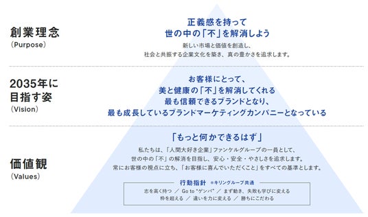 当社はこれまで、創業理念である「正義感を持って世の中の『不』を解消しよう」のもと、無添加化粧品や健康食品など、新たな市場と価値を創造してきました。その根底にあるのは、目の前のお客様の声に真摯に向き合い、本質的な解決策を提示する姿勢です。10年後も、そしてその先も選ばれ続ける企業であるために、強い正義感を持って新しい価値を創造するというDNAを、改めて未来志向で進化させていきます。その決意のもと、10年という時間軸で企業のあるべき姿を描いた長期経営構想「ファンケル・ビジョン2035(FV2035)」を策定しました。
