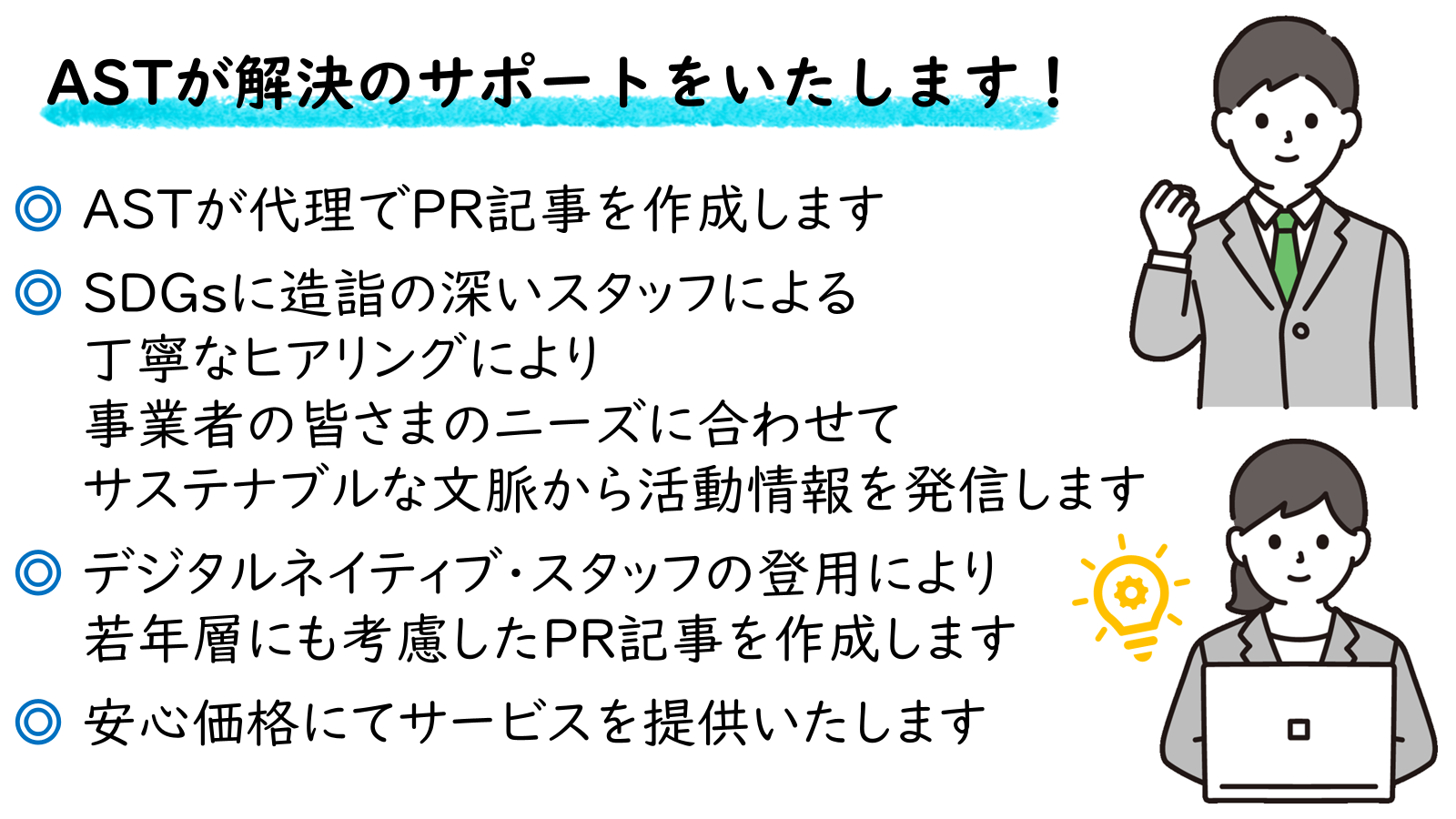 今般、本プラットフォーム及びInstagramのアカウント運用代行サービスを開設いたします。サステナブル社会の実現へ向けて、日頃、質の高い取組を進めていても、本業に時間を要し、対外的な事業PRや広報活動の時間を捻出しづらい等のお悩みをお抱えの事業者様に対し、ASTが皆様の事業内容を丁寧にヒアリングの上、事業の強みをハイライトし、サステナブルな文脈から分かりやすく活動情報を発信します。特に下記に当てはまる事業者の皆様におかれては、ぜひ本サービスの導入をご検討ください。