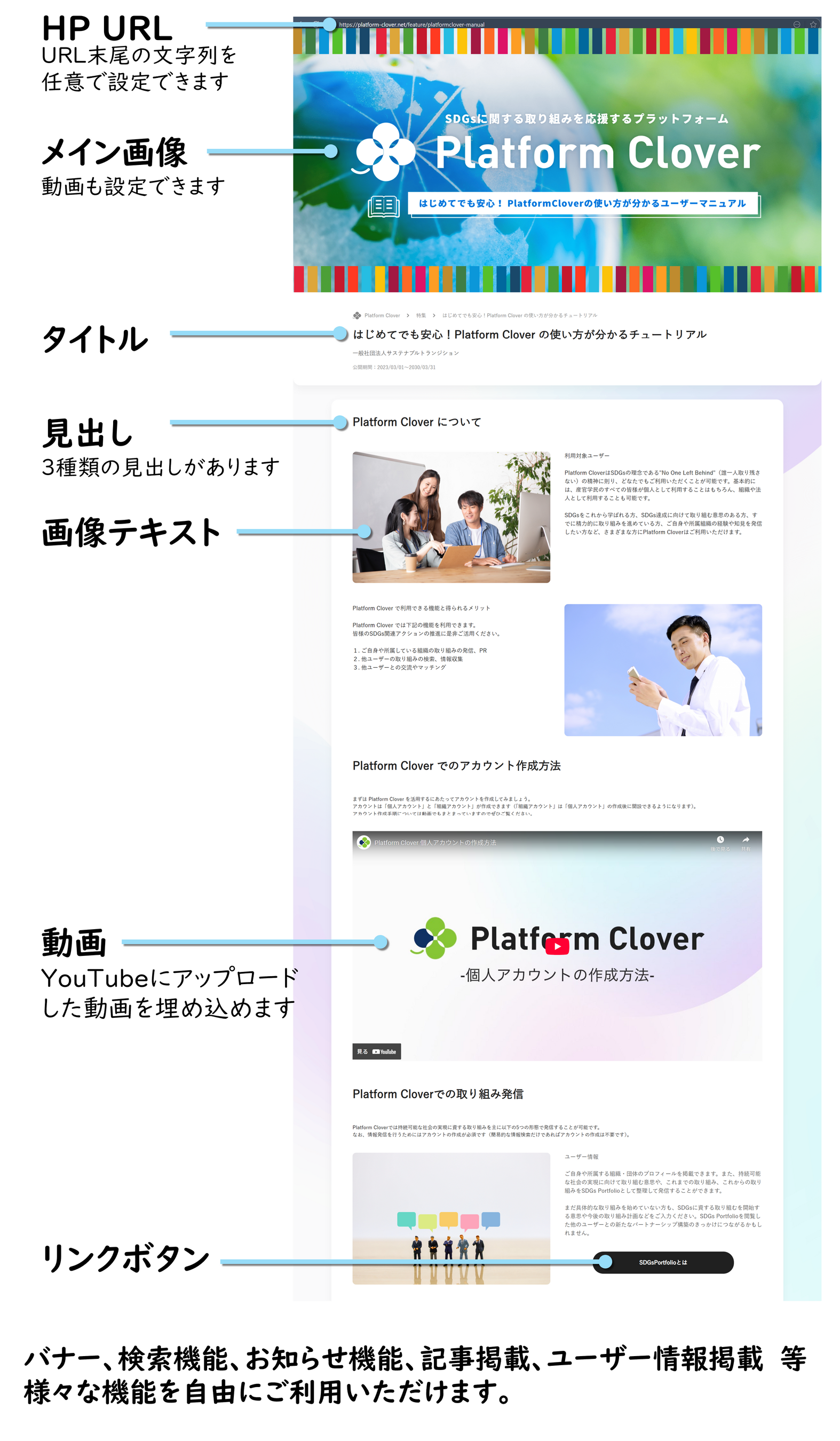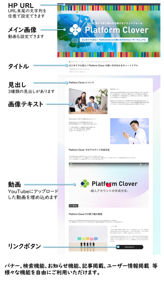 また、母体となるPlatform Cloverの機能を活用しながら特設サイトを制作できるため、通常のホームページとして一般的なポータルサイト(情報掲示板)の形式に留まらず、サステナブル情報に関心の高いPlatform Clover登録ユーザーとオンライン上で交流・連携することができ、さらには御契約団体様と活動を共にする協働先が発信した取組情報もまとめて特設サイト上に掲載することが可能です。