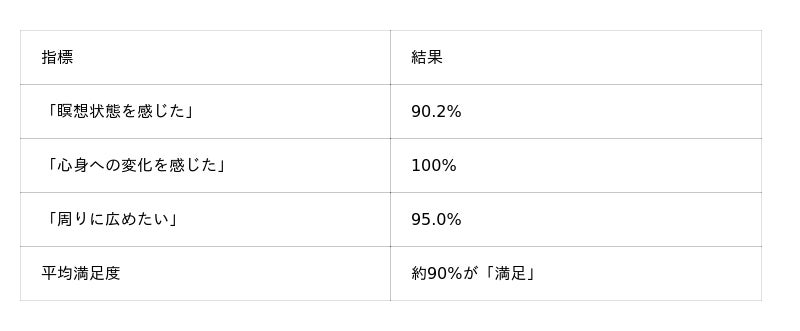 体験効果の内訳は、呼吸・身体のリラックス(34.3%)、心・感情の安定(32.8%)、脳・認知機能の向上(22.4%)と、心身の幅広い領域に及んでいます。