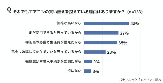 ・買い替えを控える理由は「価格が高い」(48%)、「まだ使える」(37%)、「物価高で生活費優先」(35%)