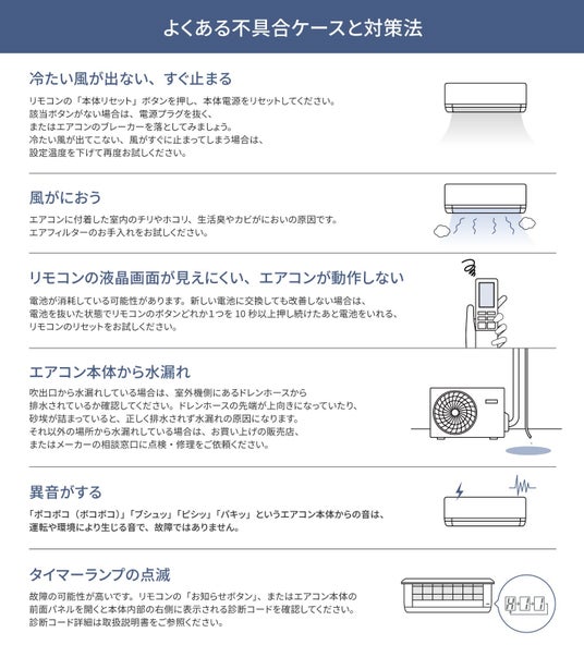 その他エアコン試運転時の不具合解決方法につきましてはパナソニックの下記公式サイトをご参照ください。 https://panasonic.jp/aircon/air_letter/news/test_run.html