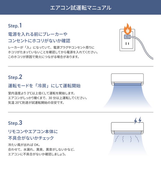 暑さが本格化し、夏の冷房シーズンに入る前には、エアコンを運転し、不具合がないか確認する「試運転」をしておくことが大切です。
