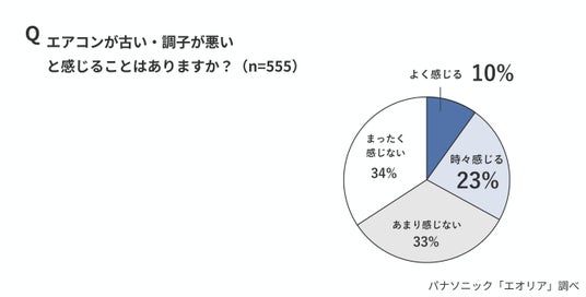 また、「エアコンが古い・調子が悪いと感じることがある」と回答した人は33%にのぼり、10年以上使用している人では50%に達しました。使用年数が長いほど不調を感じやすい傾向が見られ、不安を抱えながら使用している実態がうかがえます。