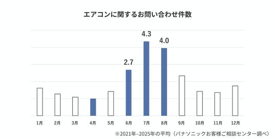 しかし、パナソニックお客様ご相談センターに寄せられるエアコンに関する相談については、例年6月~8月にお問い合わせが集中しています。過去5年(2021年~2025年)の平均では、4月のお問い合わせ件数と比較すると6月は2.7倍、7月は4.3倍、8月は4.0倍と、夏本番に向けて3倍~4倍まで急増しています。
