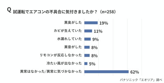 ・試運転でエアコンの不具合に気づいた人は38%、最多は「異臭」(19%)、次いで「カビ」(11%)、「水漏れ」(9%)