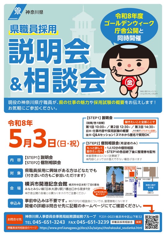 神奈川県では、本県で働くことを就職先の一つとして検討いただくきっかけづくりを目的に、「県職員採用説明会&相談会」を開催します。