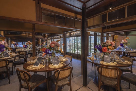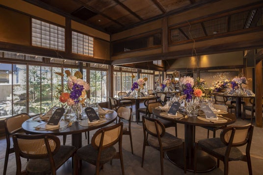 レストラン会場は座敷と離れを改装。欄間や柱などの日本建築の様式をそのまま残している。どの席からも日本庭園を望むことができる
