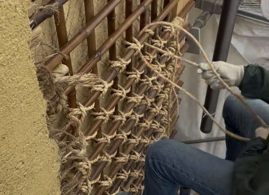 土壁の改修のため、竹を編んで土壁の土台にする小舞による作業。小田原城の天守閣の内装を手掛けた職人さんによる
