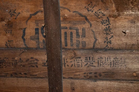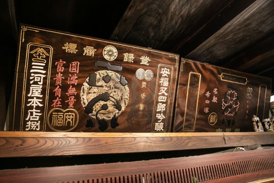 当時の酒箱を活用した天井(「麒麟麦酒株式会社」と記載されている)も望むことができる。