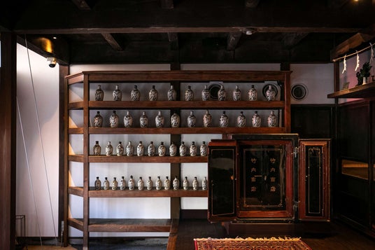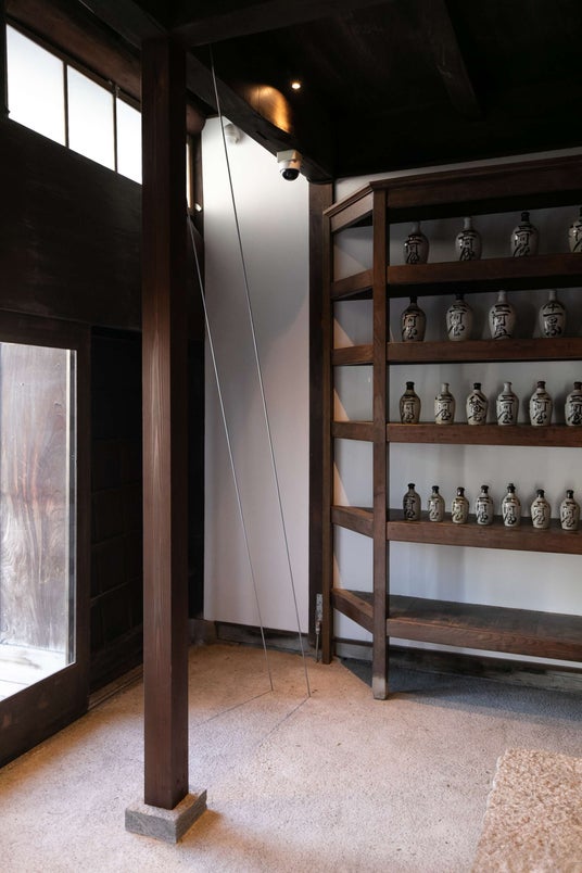 かつて酒屋だった総けやき作りのエントランス。2尺八寸のけやきの一枚板の梁や、「八幡前三河屋」と書かれた徳利、金庫などがそのまま残る