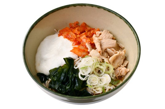 旨みの強い豚キムチを、さっぱりとしたとろろで食べるかきこみ系そばです。